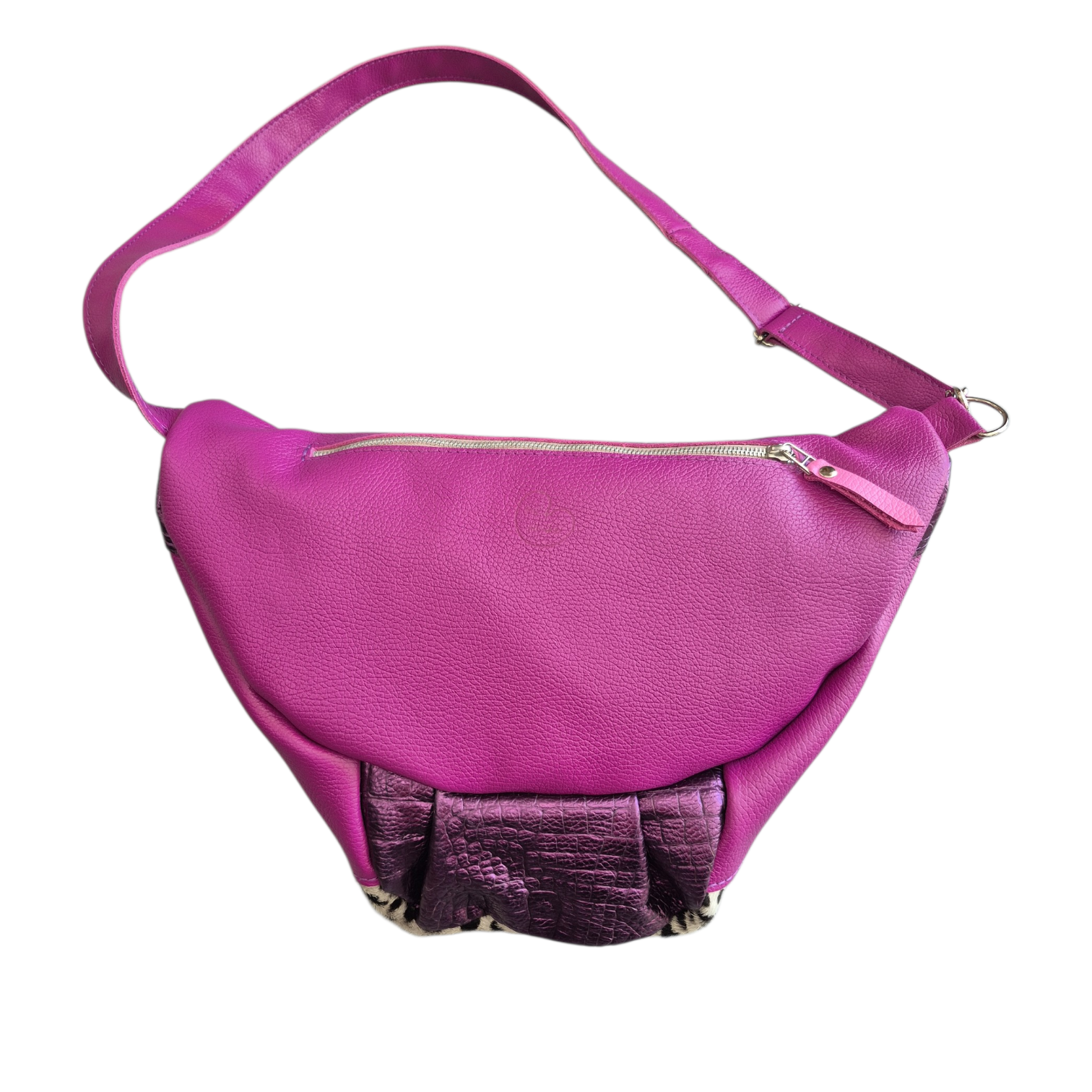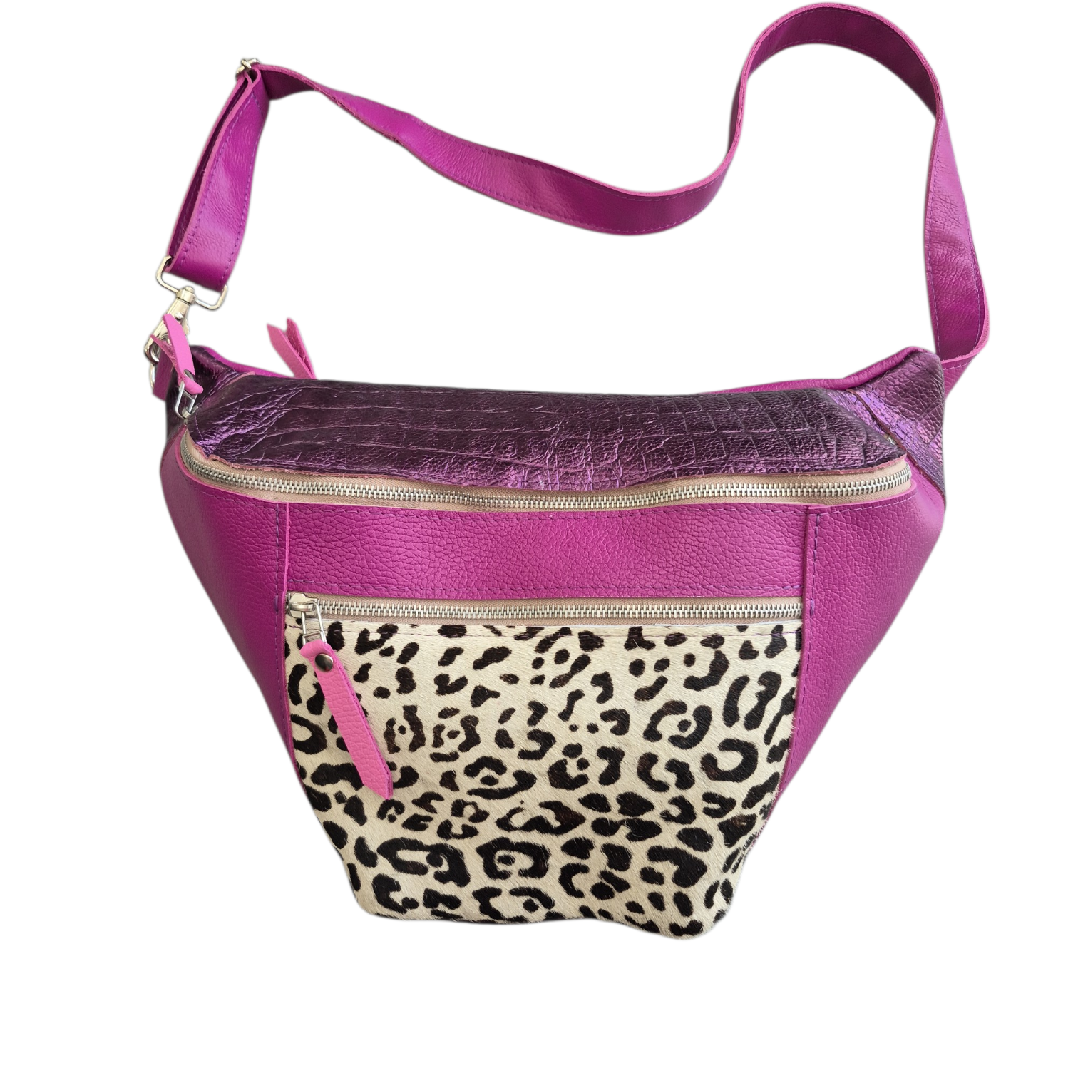 Cindy is uitgevoerd in plum en paars metallic croco leer en cheetah vacht.