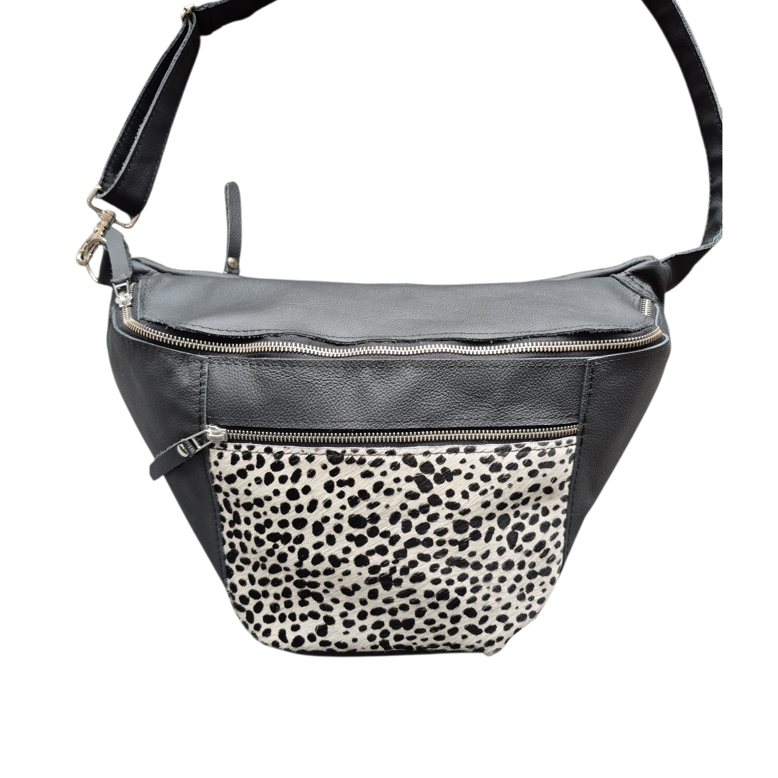 Cindy is uitgevoerd in diepzwart leer en vlekkie wit vacht.