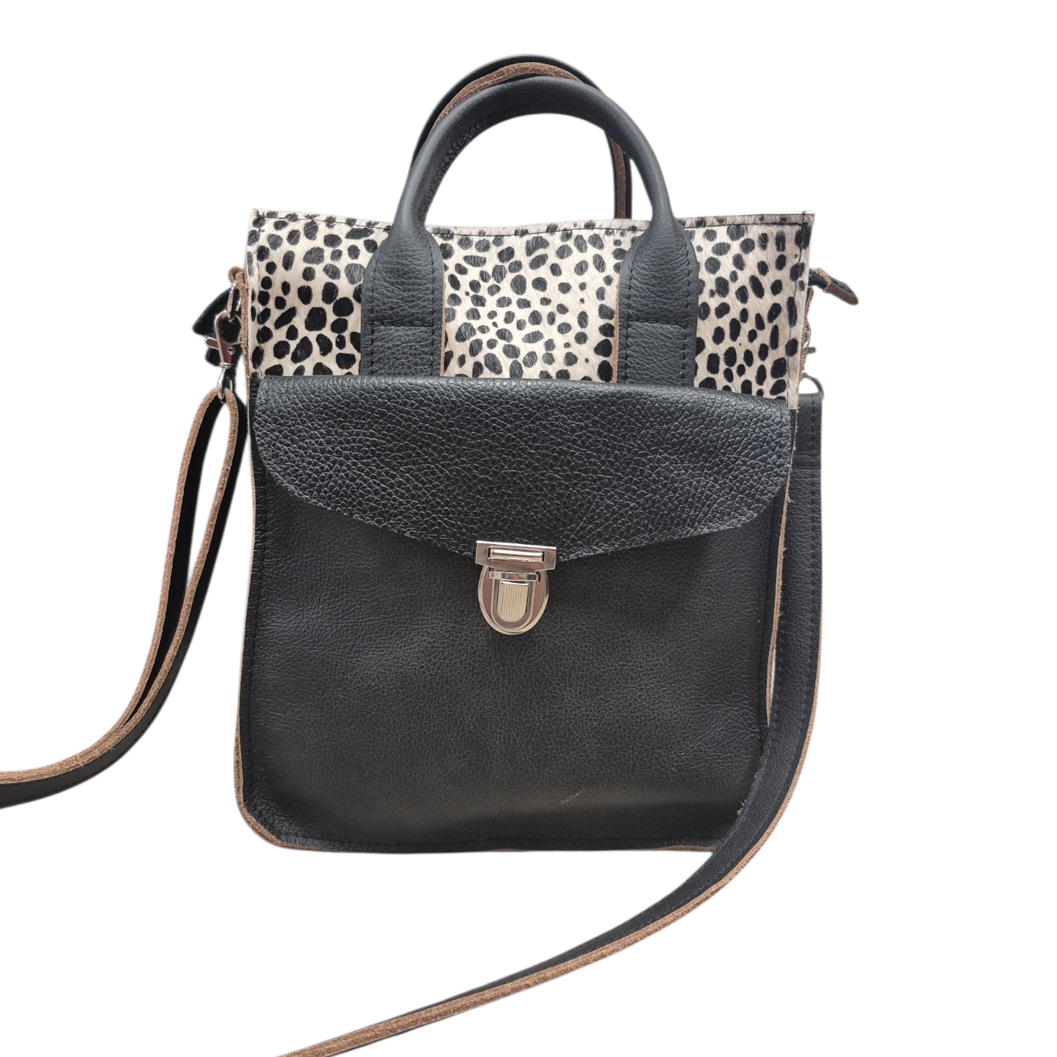 Hilde is uitgevoerd in zwart met bruine rand leer, diepzwart leer en vlekkie wit vacht.