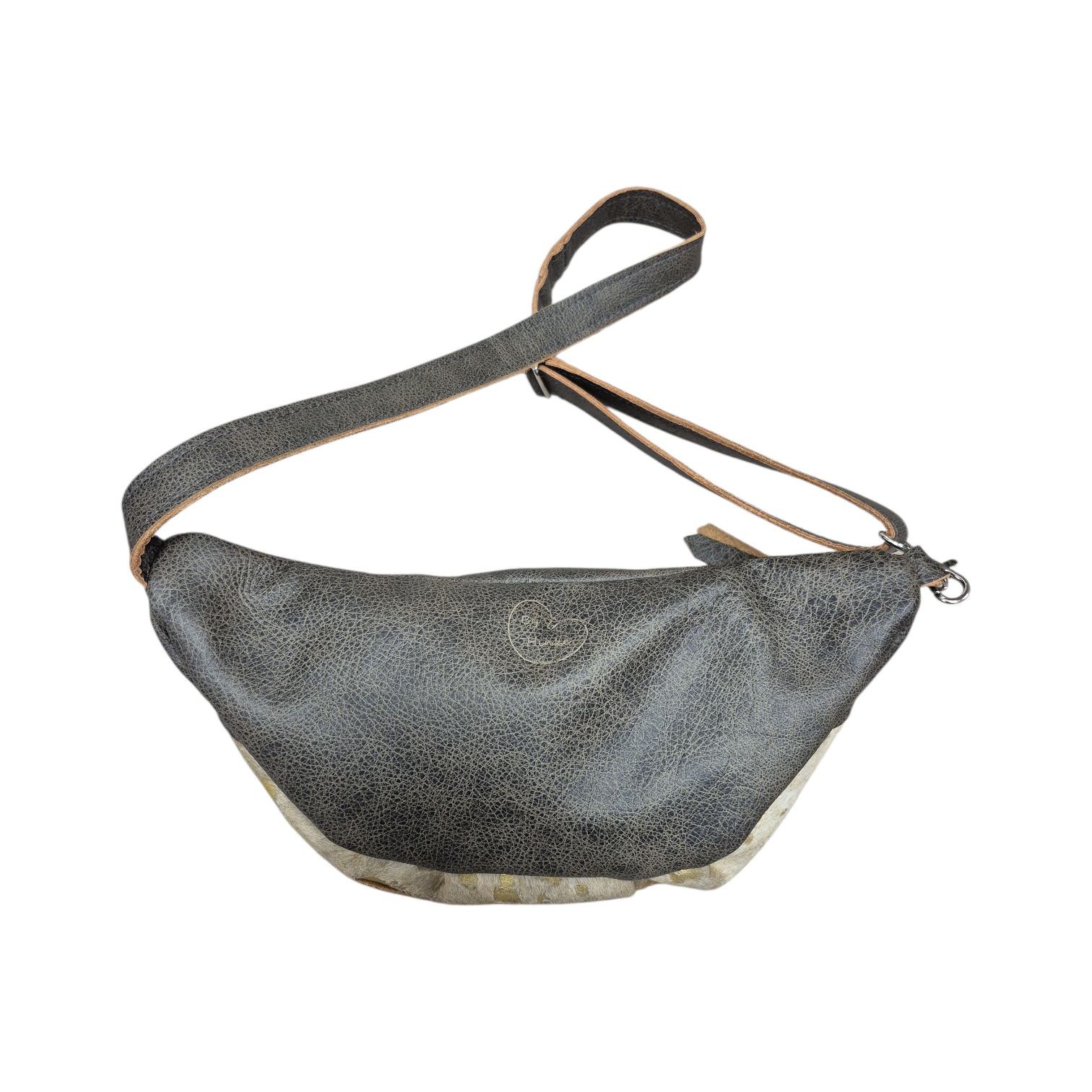 Hippie is uitgevoerd in grijs leer en vintage gold vacht.