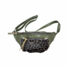 Hippie is uitgevoerd in olijf leer, giraffe vacht en metallic gold details.