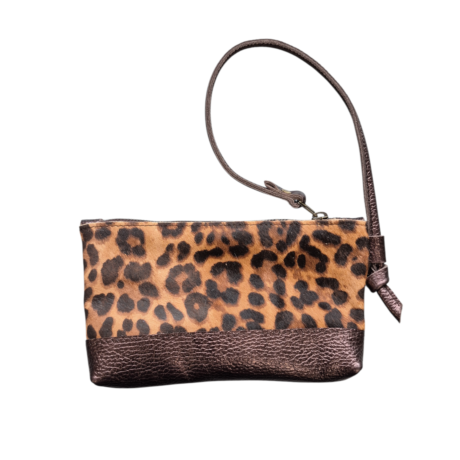 Jente is uitgevoerd in bruin metallic leer en luipaard vacht.