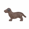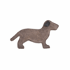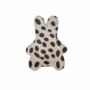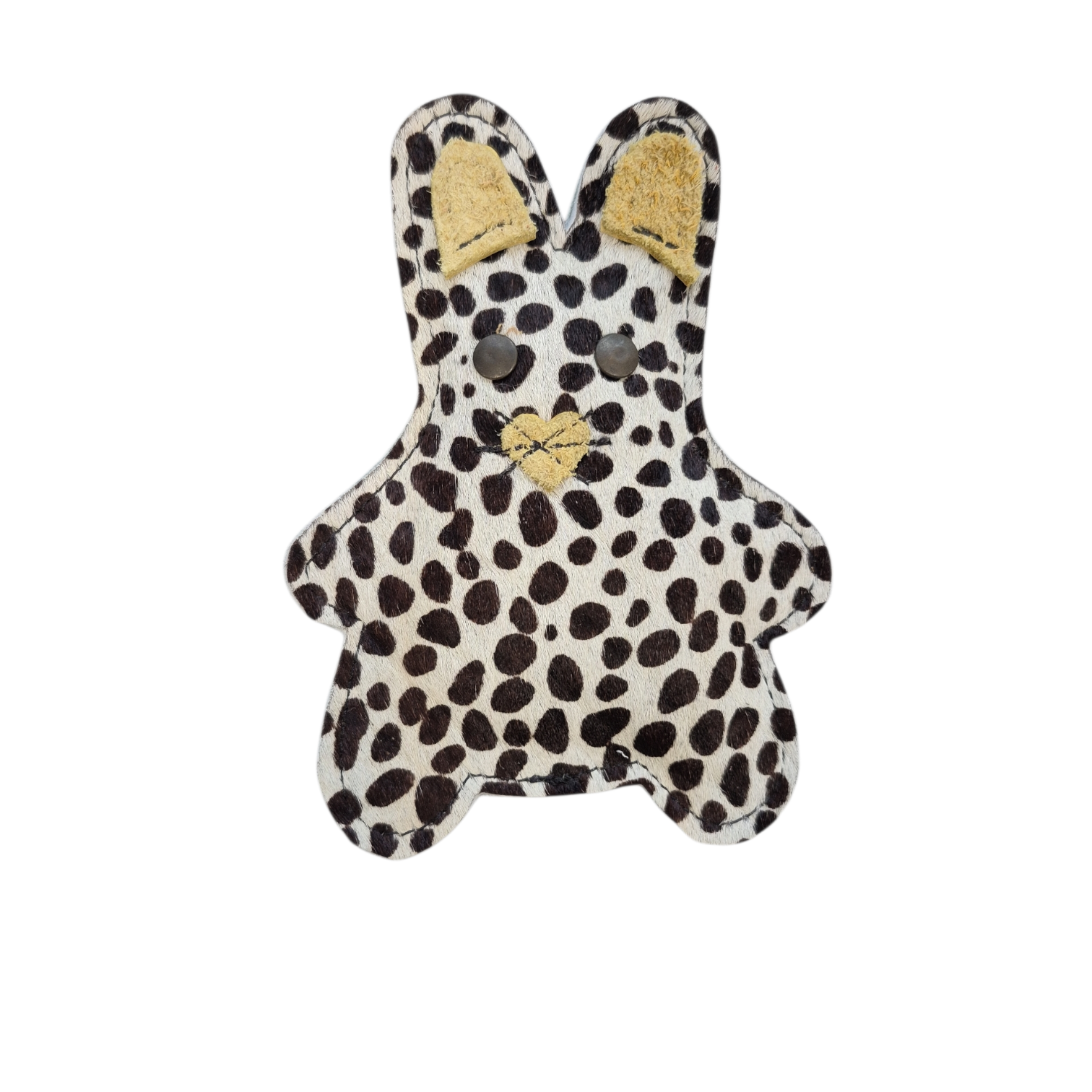 konijn is uitgevoerd in vlekkie wit vacht, dots vacht en geel leer.