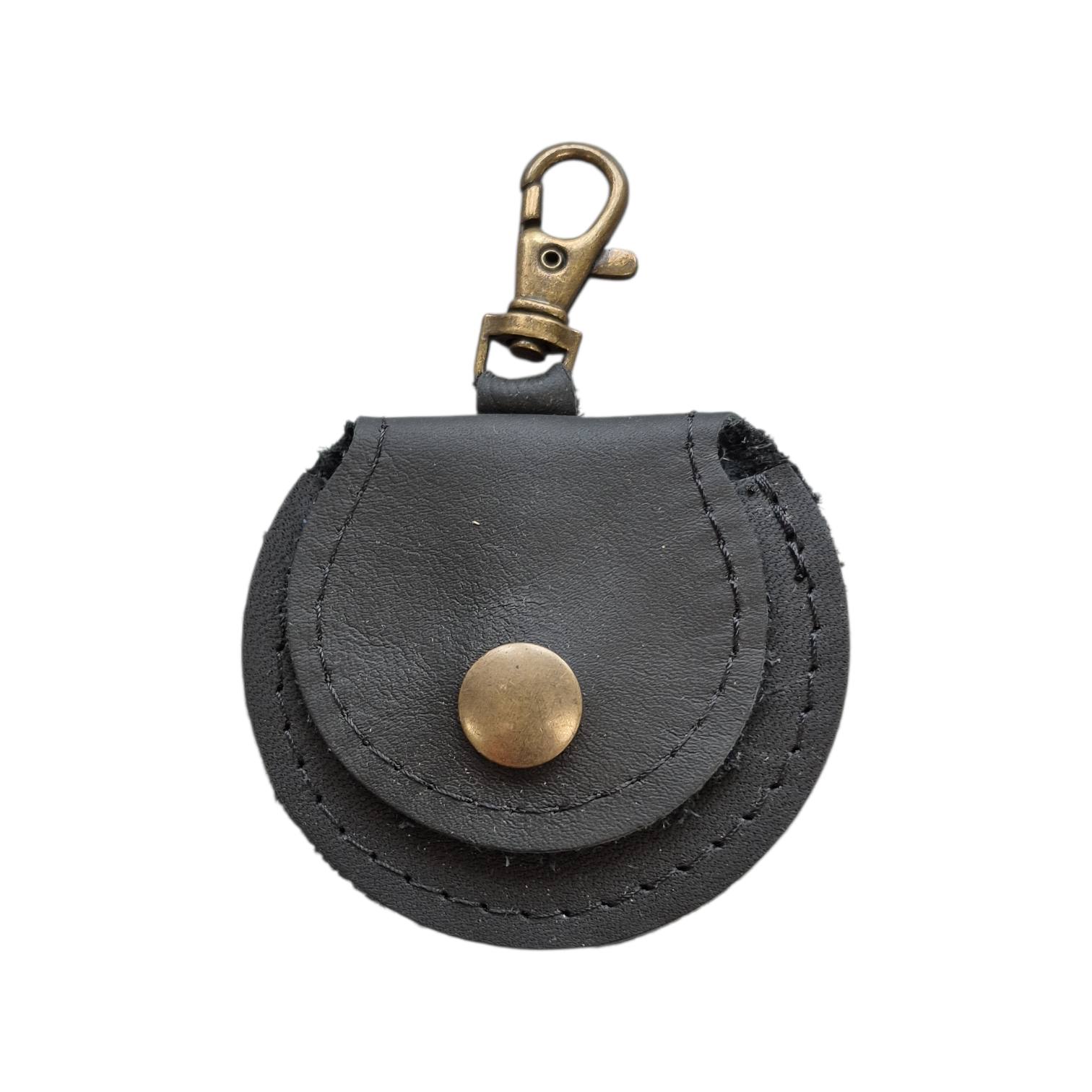 Uitgevoerd in diepzwart leer en bronzen accessoires.