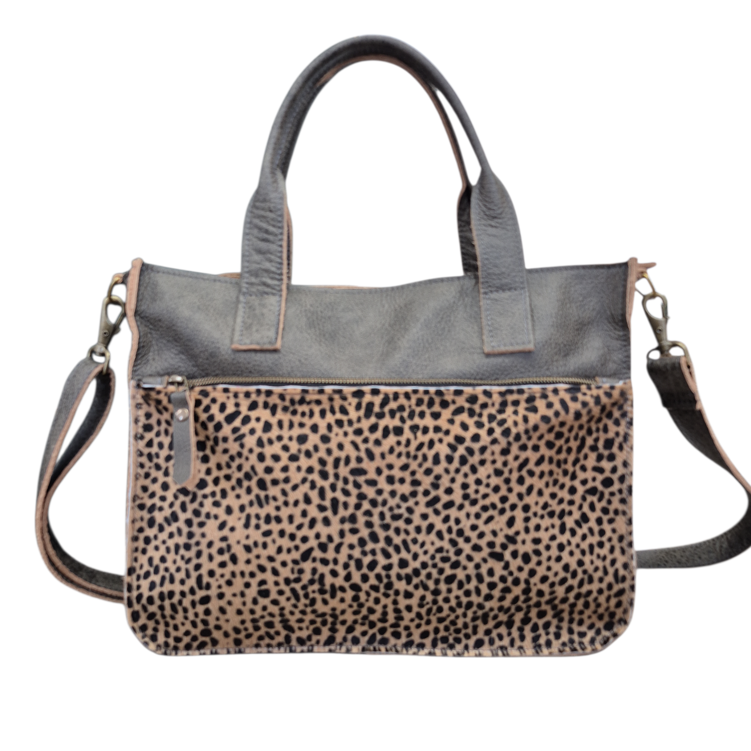 Nelleke is uitgevoerd in grijs leer en vlekkie beige vacht.