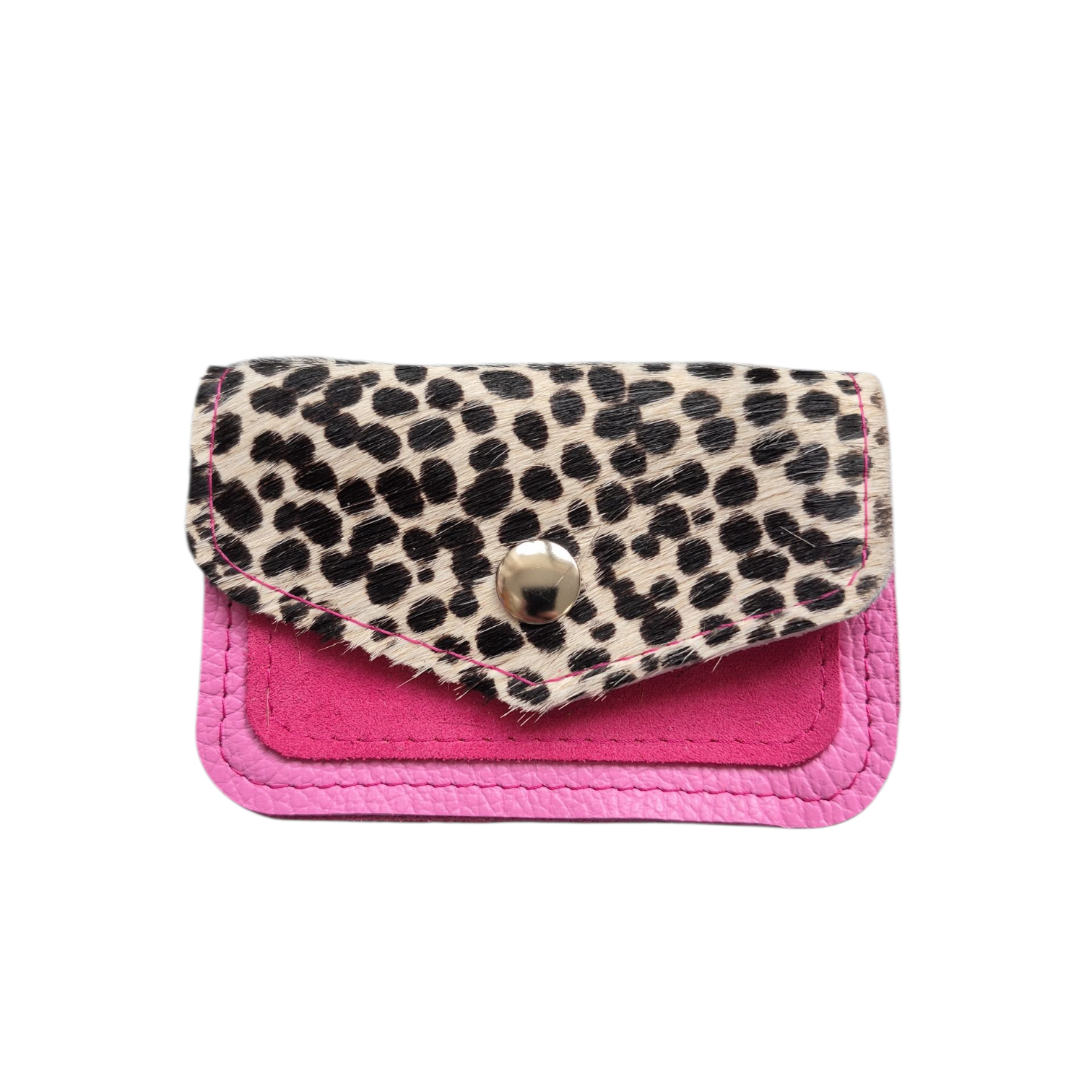 Sander is uitgevoerd in twee tinten roze leer en vlekkie wit vacht flap.