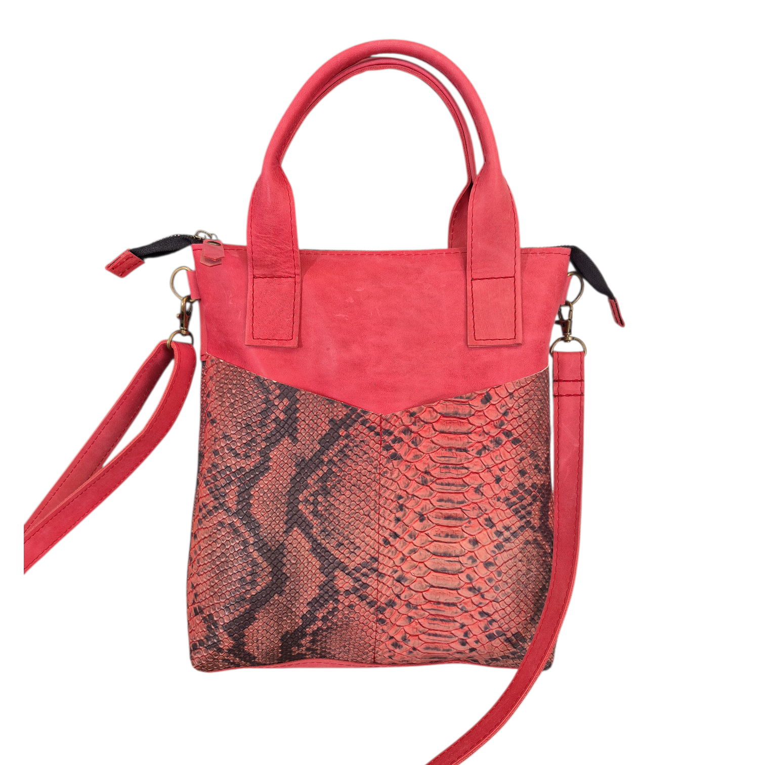 Sanne is uitgevoerd in rood leer en snake print leer.