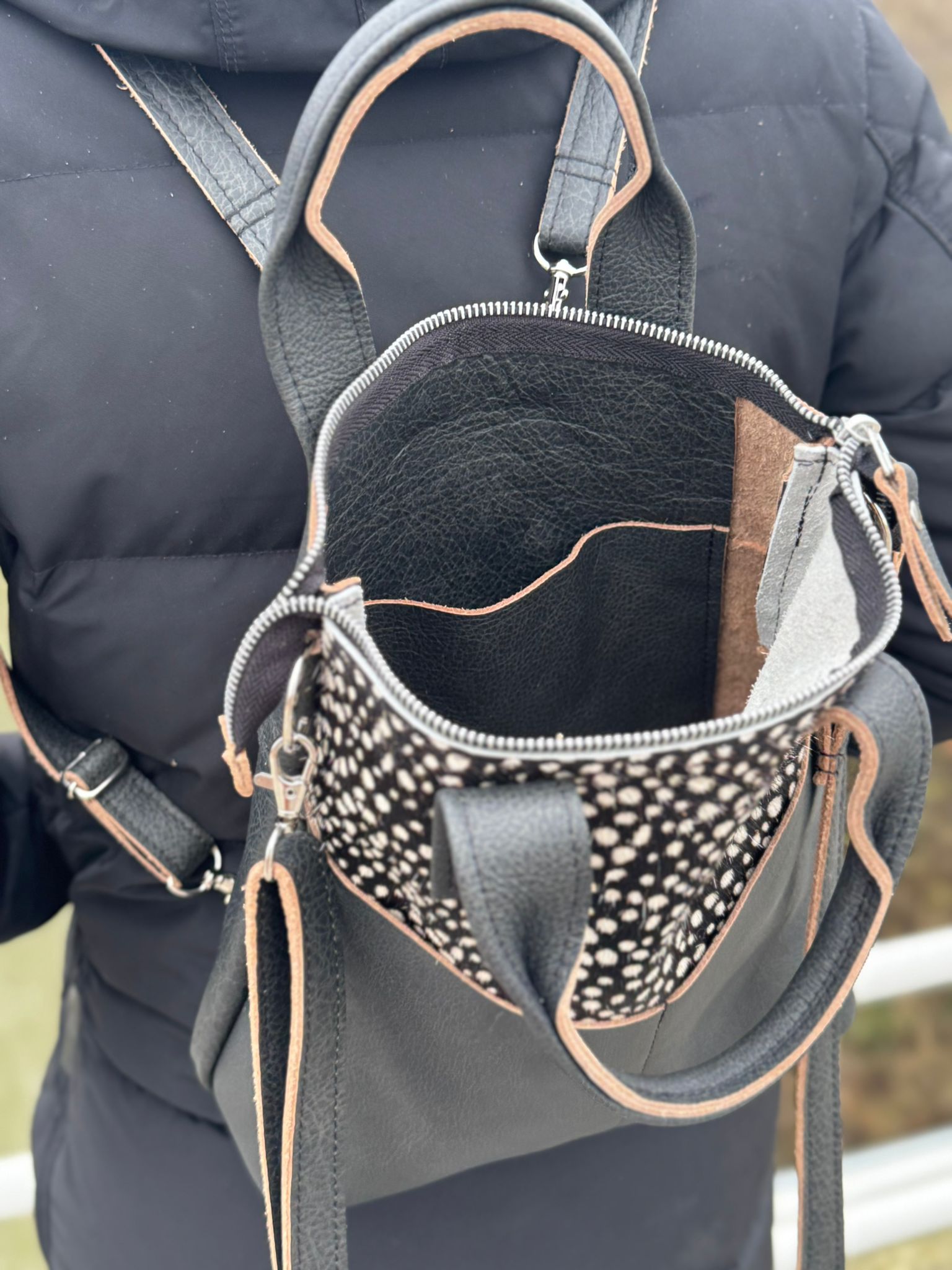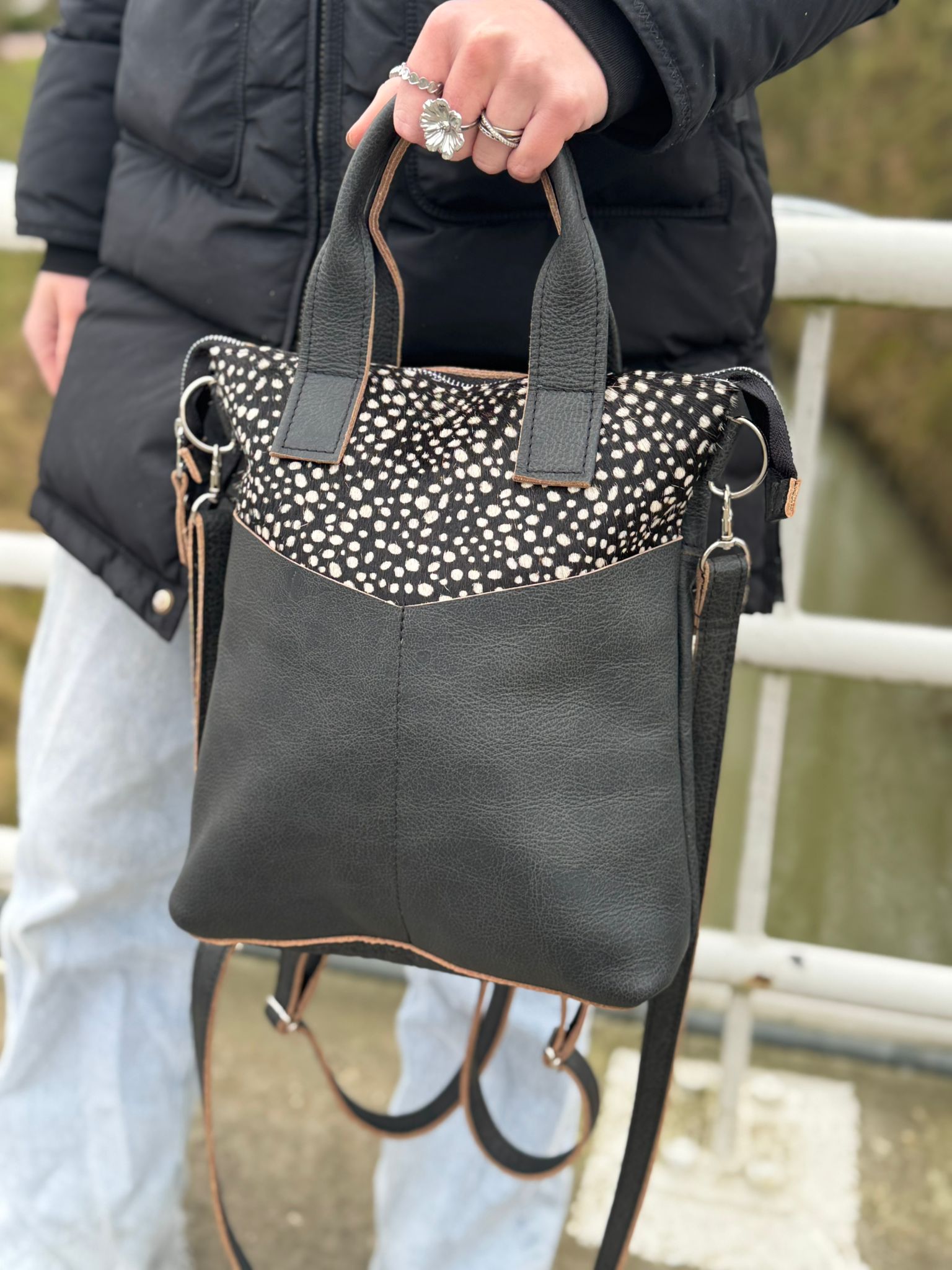 De basiskleur is van zwart met bruine rand leer.