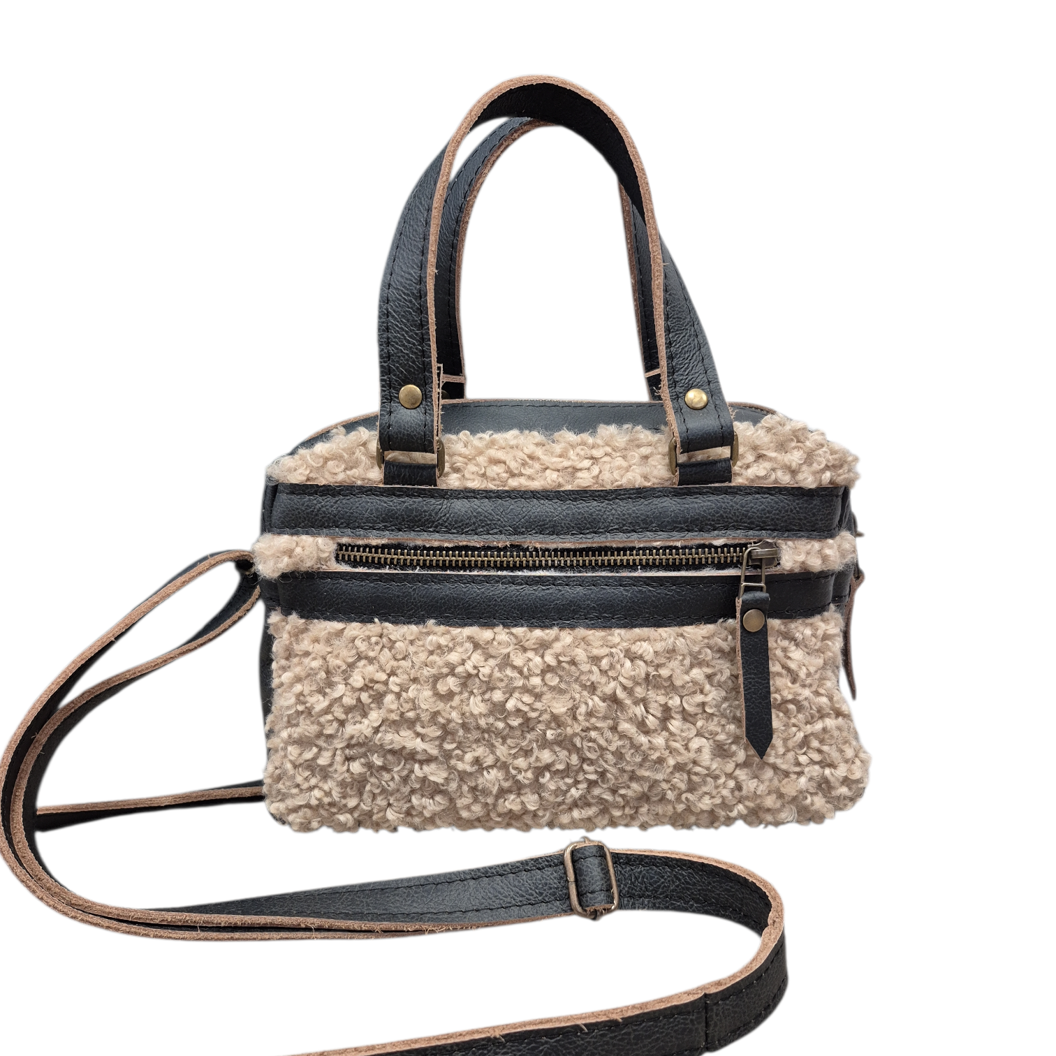 Sascha is uitgevoerd in zwart leer en teddy stof.