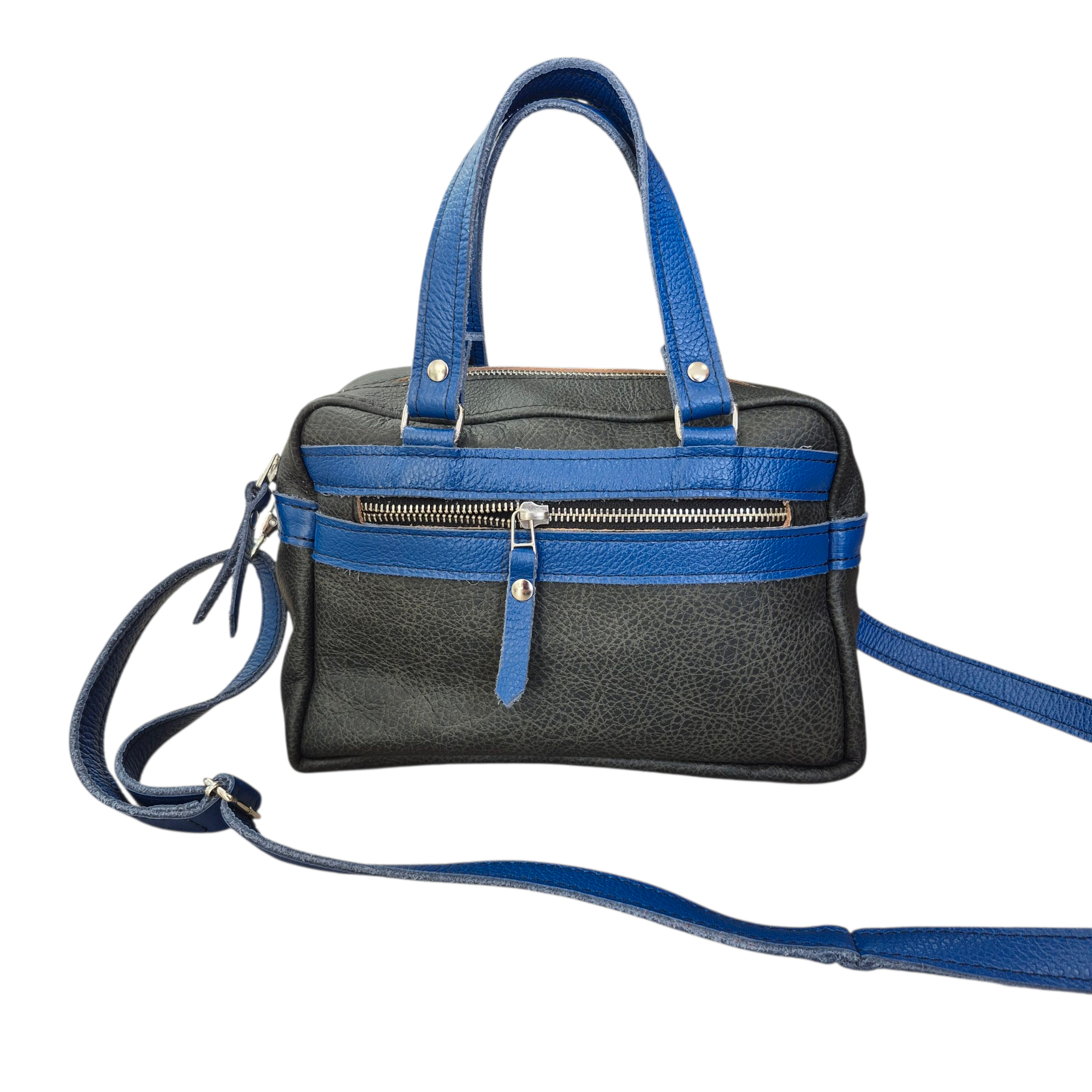 Sascha is uitgevoerd in zwart met bruine rand leer en blauwe accenten.