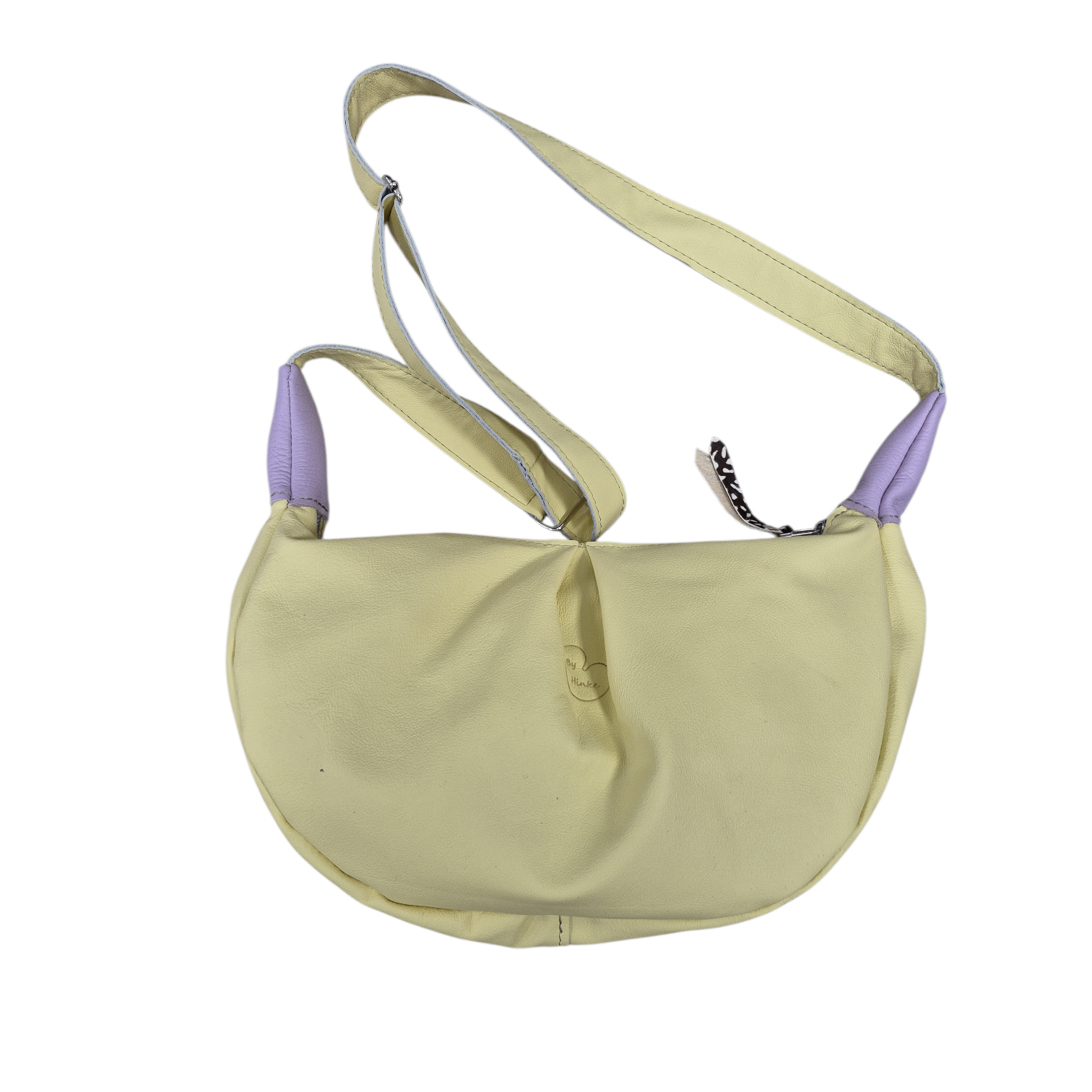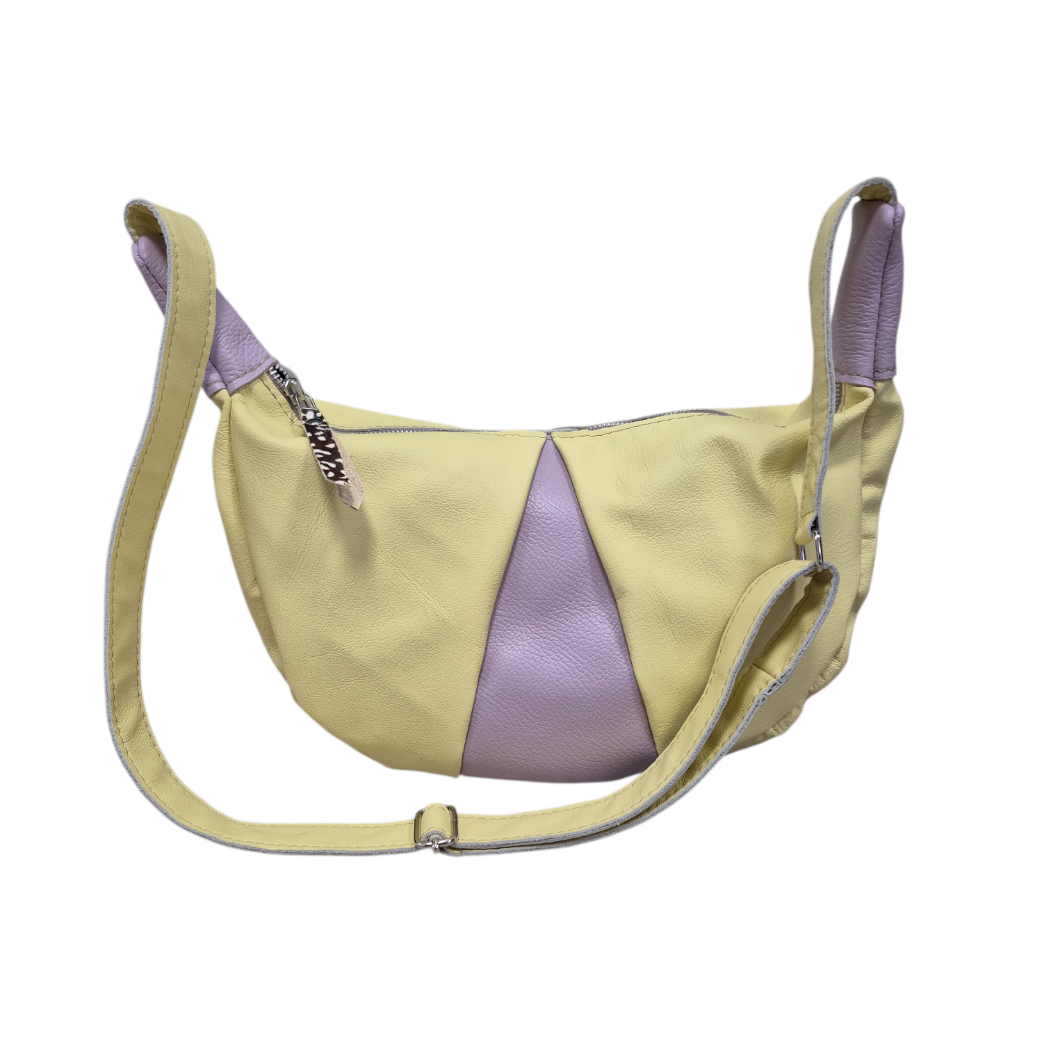 Sebastiaan is uitgevoerd in licht geel en lila leer met een klein stukje vacht aan de rits.