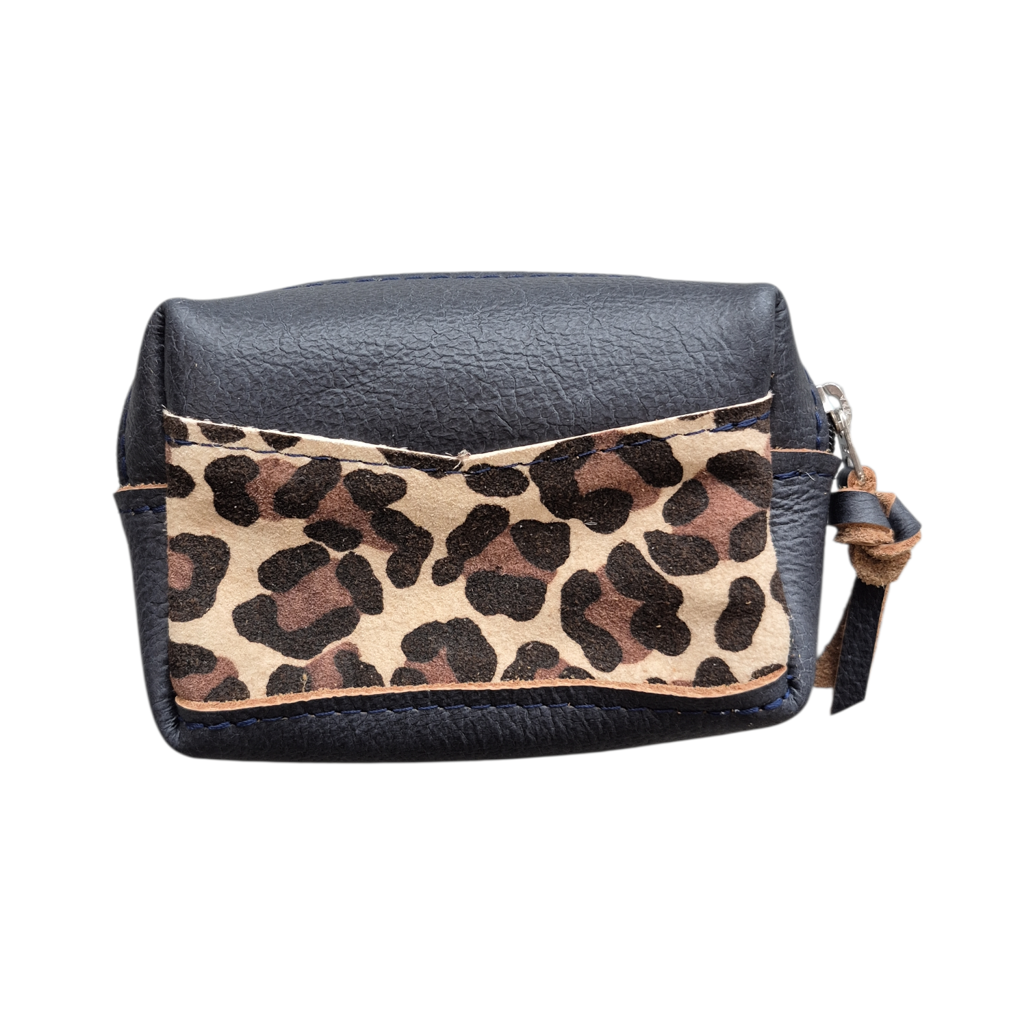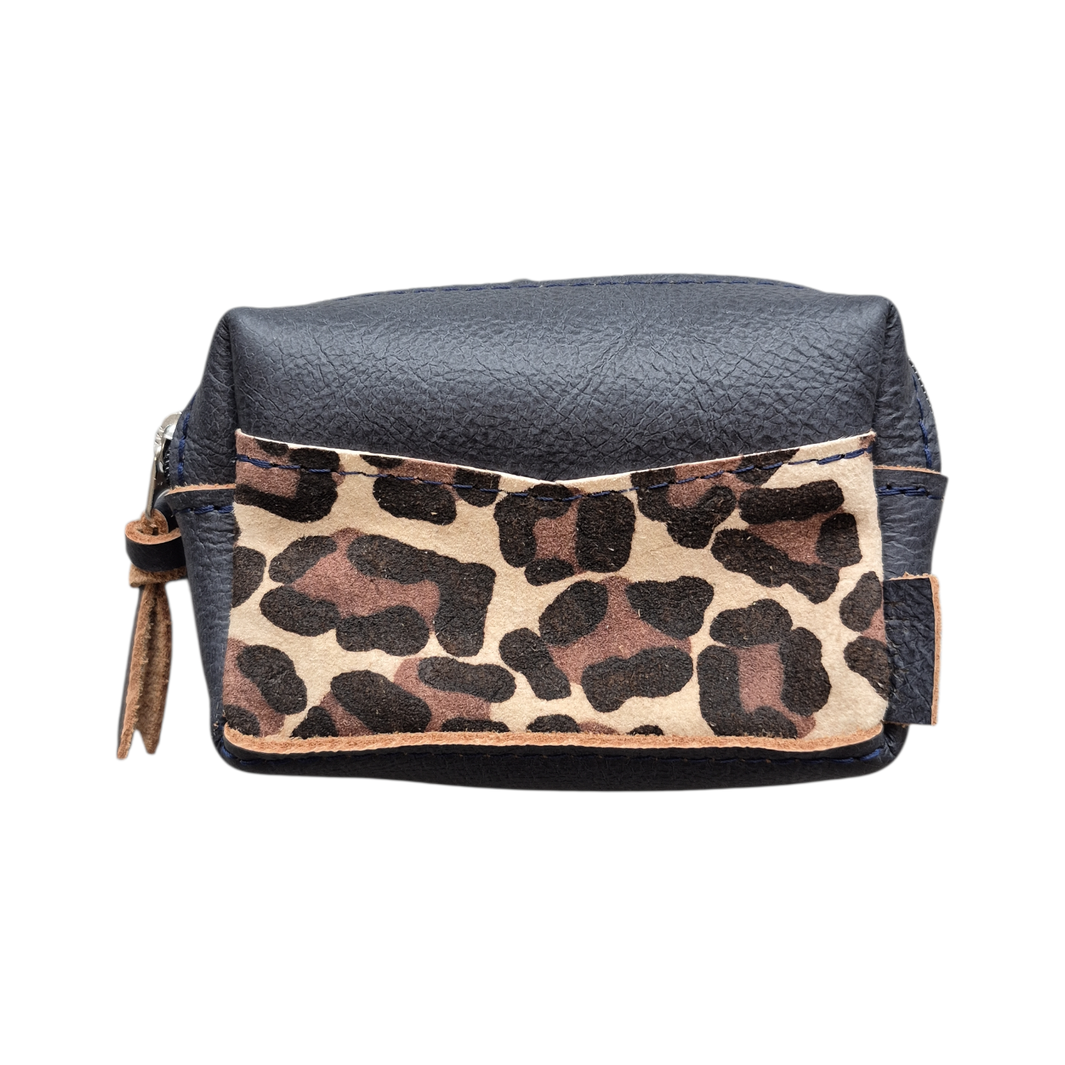Silke is uitgevoerd in blauw leer en luipaard leer.