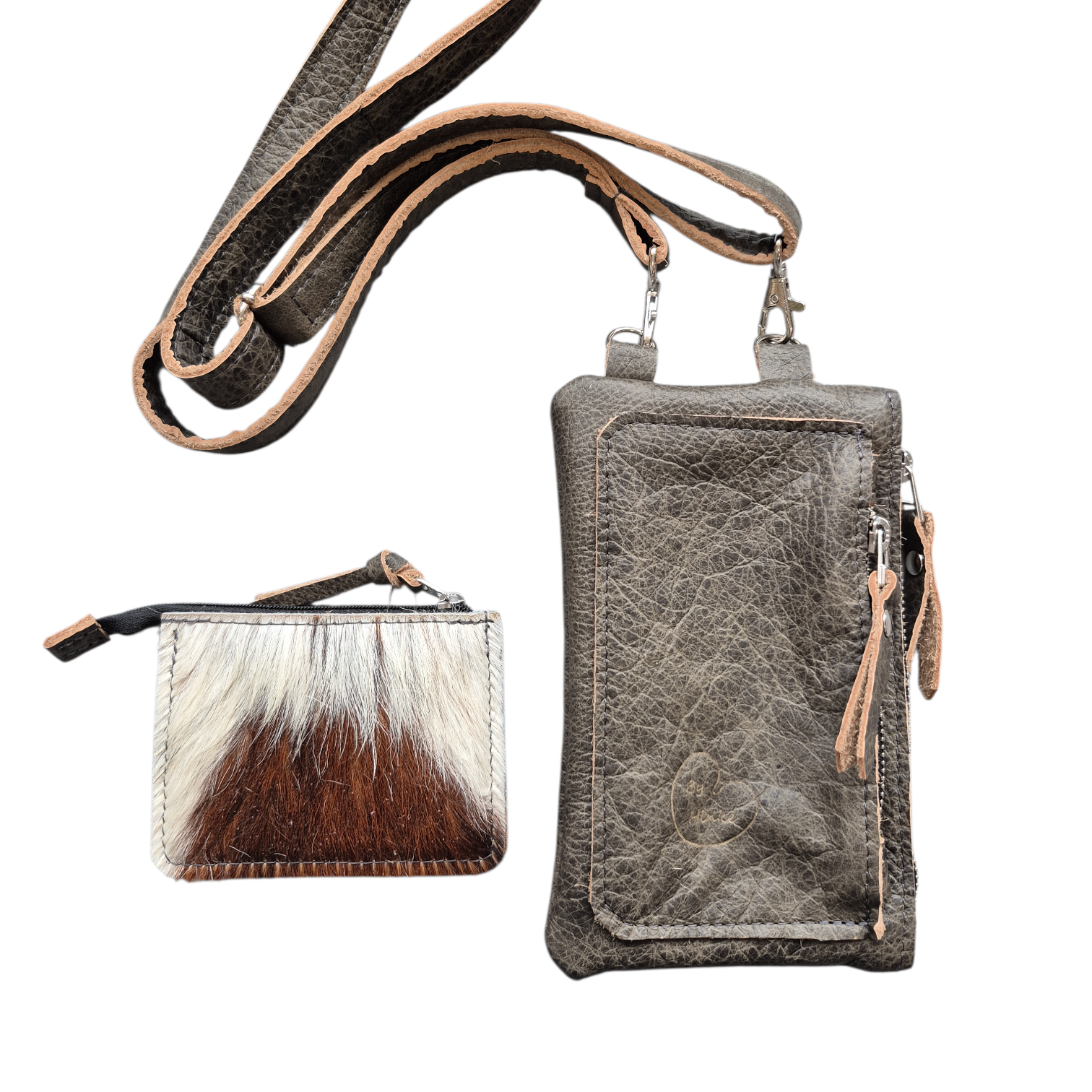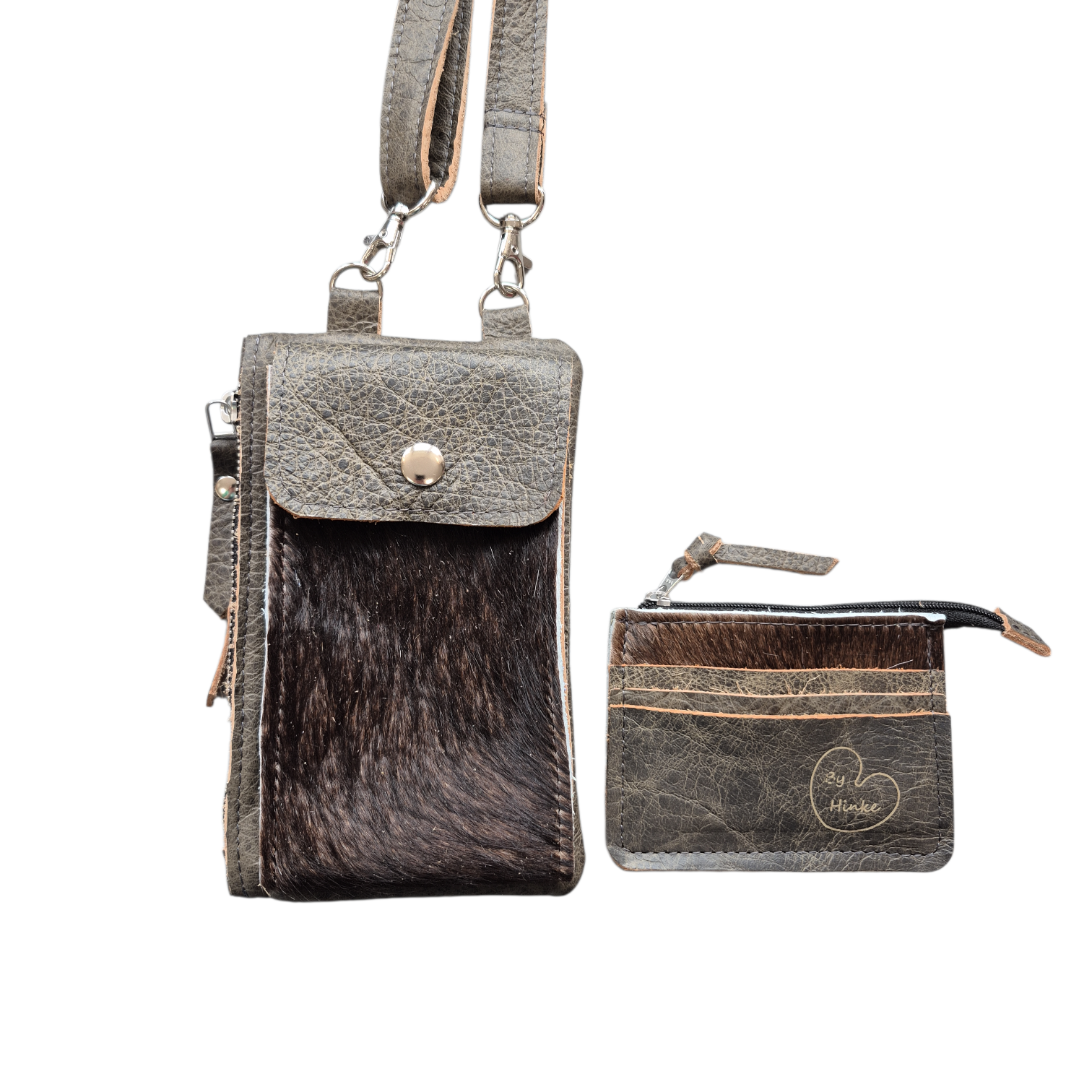 In grijs leer en bruin vacht.