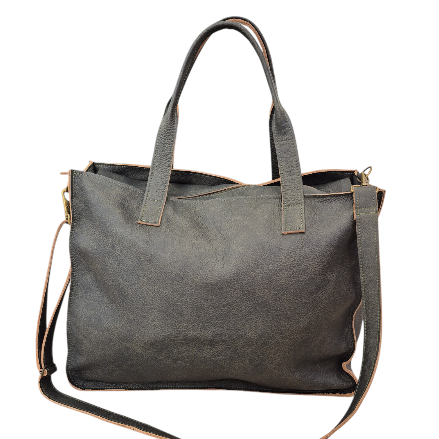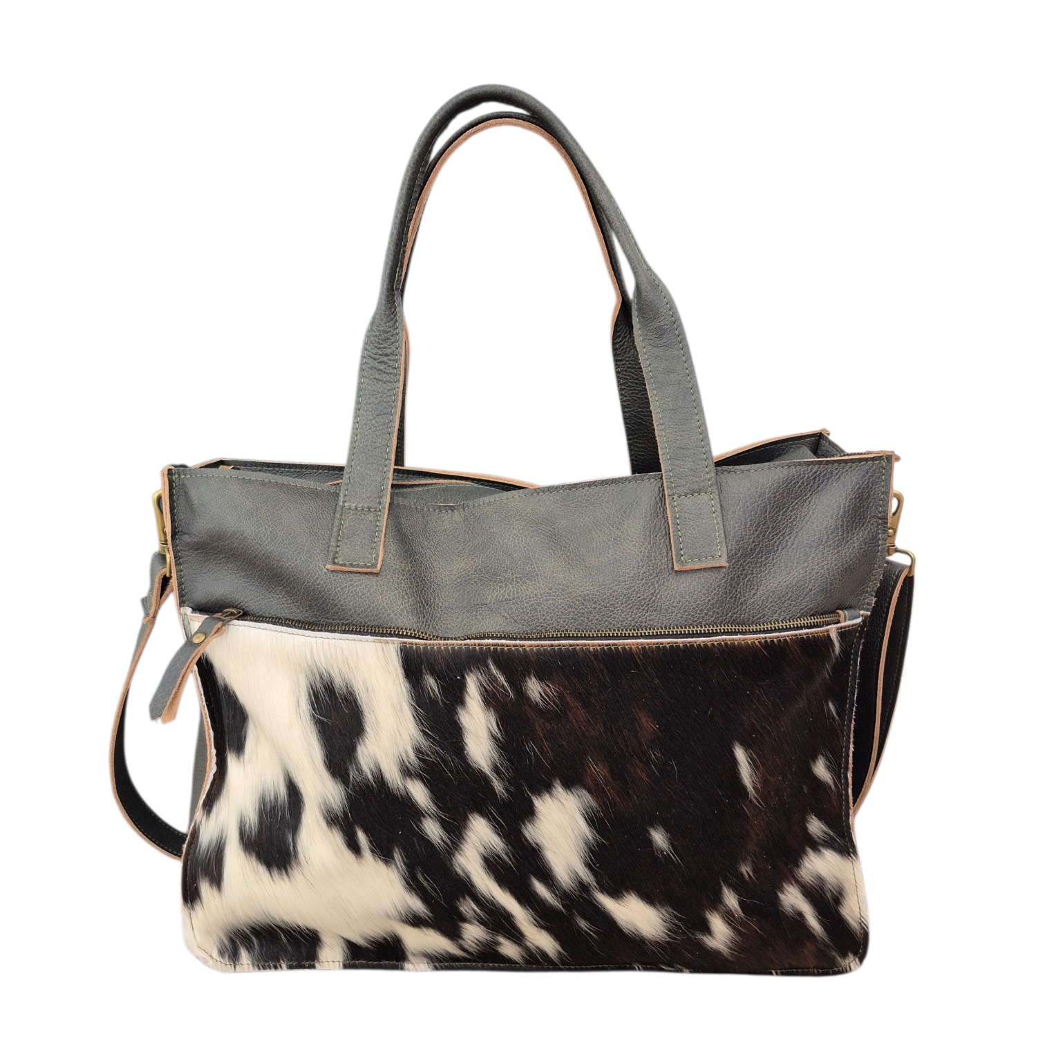 Deze Tantel Nel is uitgevoerd in donkergroen leer en een prachtige koeienvacht.